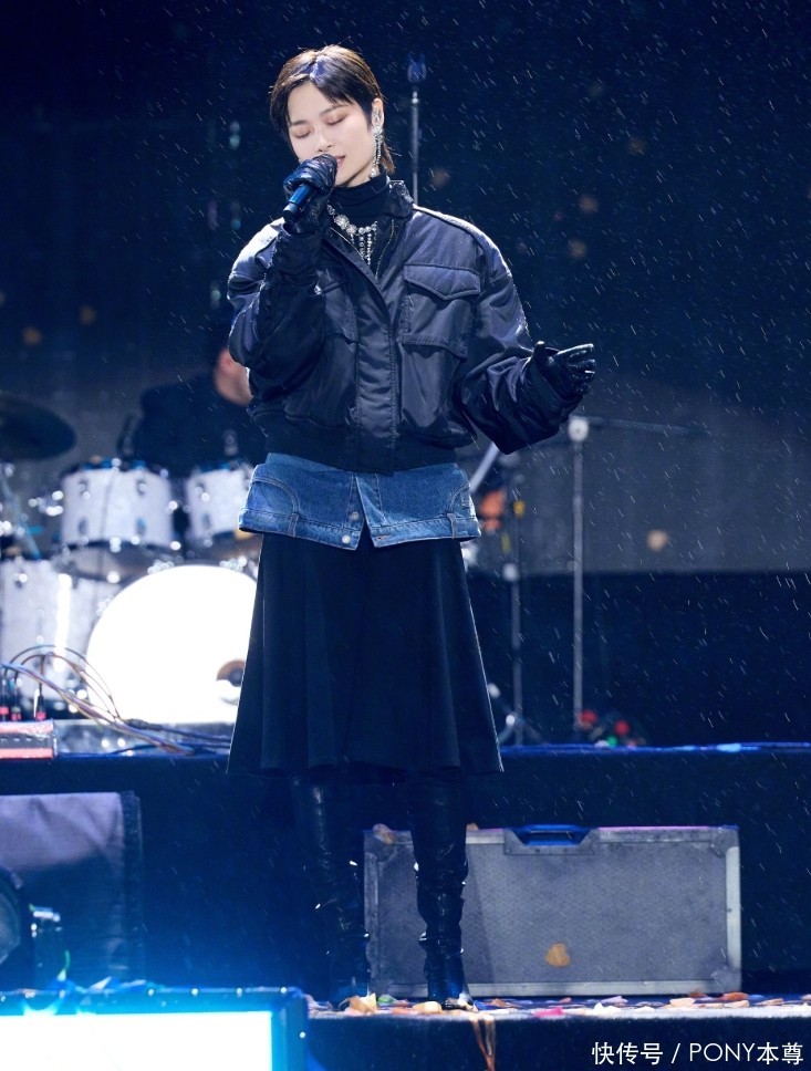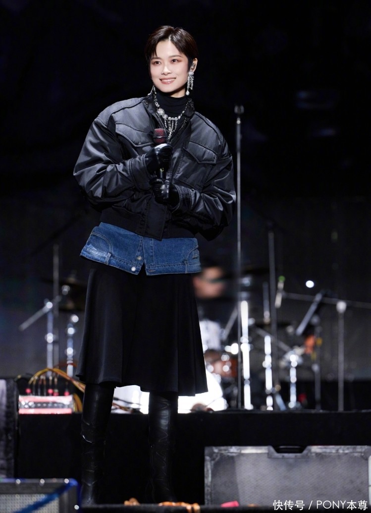 裙摆的长度与版型恰到好处,搭配一双黑色长筒靴,靴筒与裙摆无缝衔接,不仅拉长了腿部视觉线条,更强化了整体造型的酷飒氛围。这种“上短下长”的搭配逻辑,既符合舞台造型的视觉冲击力需求,又能凸显身形优势,让整体造型更具张力。